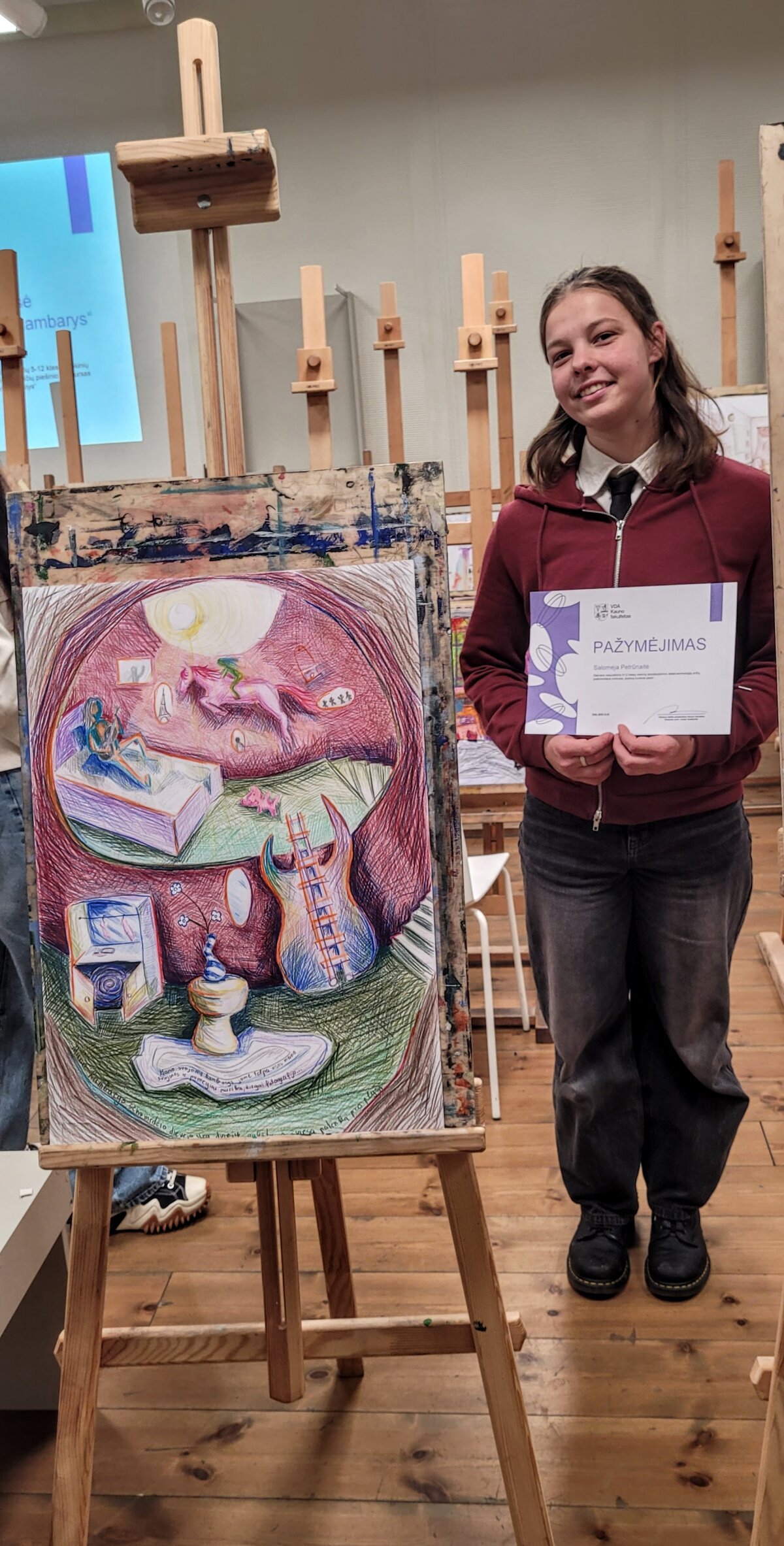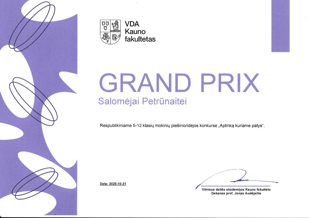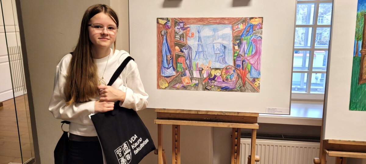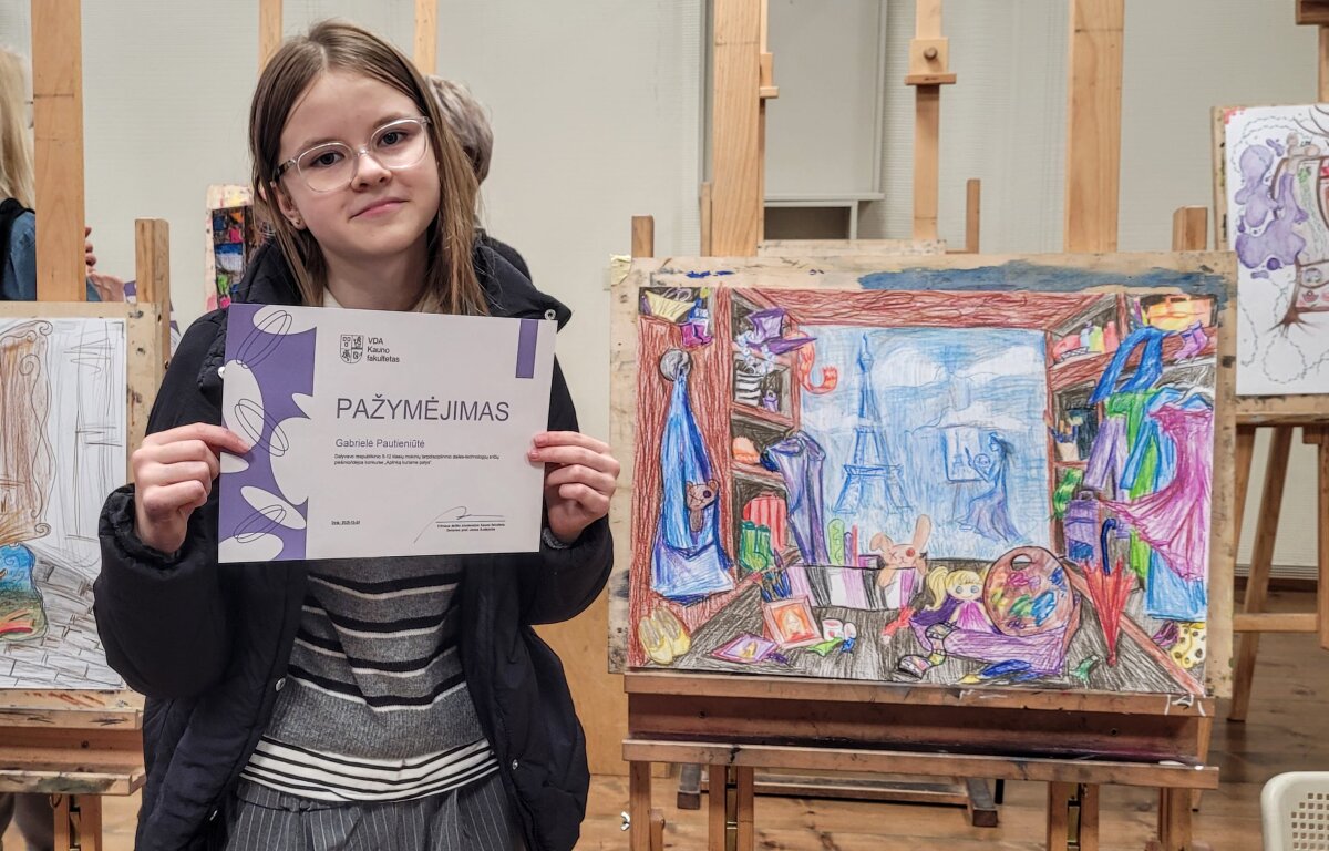 Vilniaus dailės akademijos (VDA) Kauno fakultetas jau septintąjį kartą organizavo respublikinį dailės konkursą 5–12 klasių mokiniams. Mūsų mokiniai jame dalyvavo ketvirtą kartą. Gimnazijai atstovavo 6 klasės mokinė Urtė Karbauskaitė (mokytoja Diana Stelmakovaitė), 7 klasės mokinė Gabrielė Pautieniūtė (mokytoja Justina Šaltė), IIa gimnazijos klasės mokinė Salomėja Petrūnaitė (mokytoja Vilija Lesauskienė) ir IIIb gimnazijos klasės mokinė Liepa Burškaitytė (mokytoja Aida Juškaitė). Konkurso rezultatai netgi pranoko mūsų lūkesčius: Salomėja laimėjo konkurso Grand Prix, jos darbą komisija pripažino geriausiu iš 80 konkurso dalyvių darbų; Gabrielė – I vietą savo amžiaus grupėje, o Liepa – III vietą. Tai didžiulis pasiekimas, žinant, jog konkurso komisija itin reikli ir kompetentinga: pirmininkas – prof. Jonas Audėjaitis (VDA Kauno fakulteto dekanas), nariai – prof. Virgilijus Trakimavičius (grafikos dizaineris, VDA Kauno fakulteto Dizaino katedros vedėjas), doc. Rimantas Giedraitis, (architektas, VDA Kauno fakulteto Architektūros katedros vedėjas, Rebeka Bruder (tapytoja, Kauno dailininkų sąjungos Kauno skyriaus pirmininkė), Danguolė Lunskienė (Kauno dailės gimnazijos dailės mokytoja metodininkė).