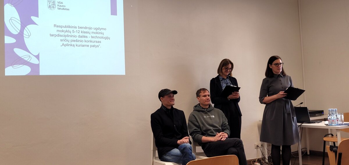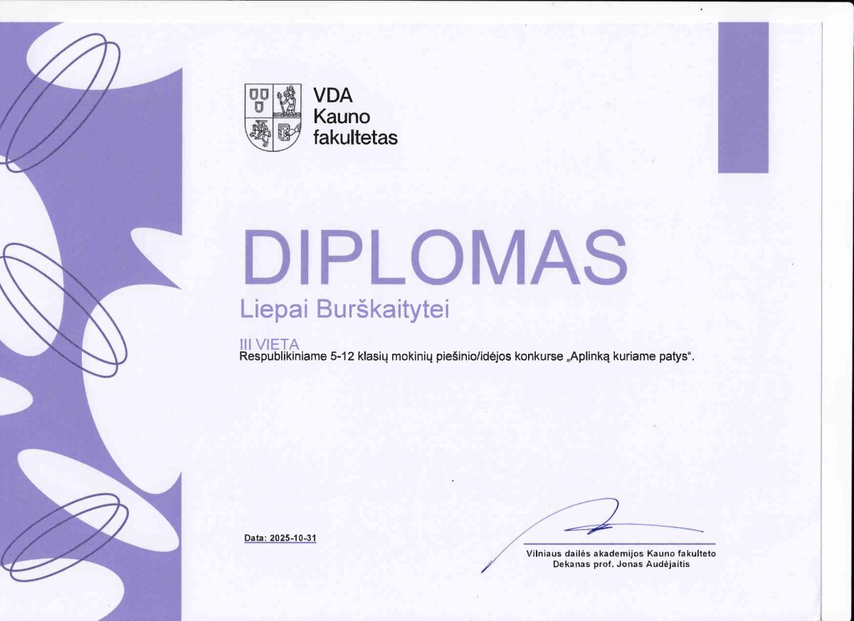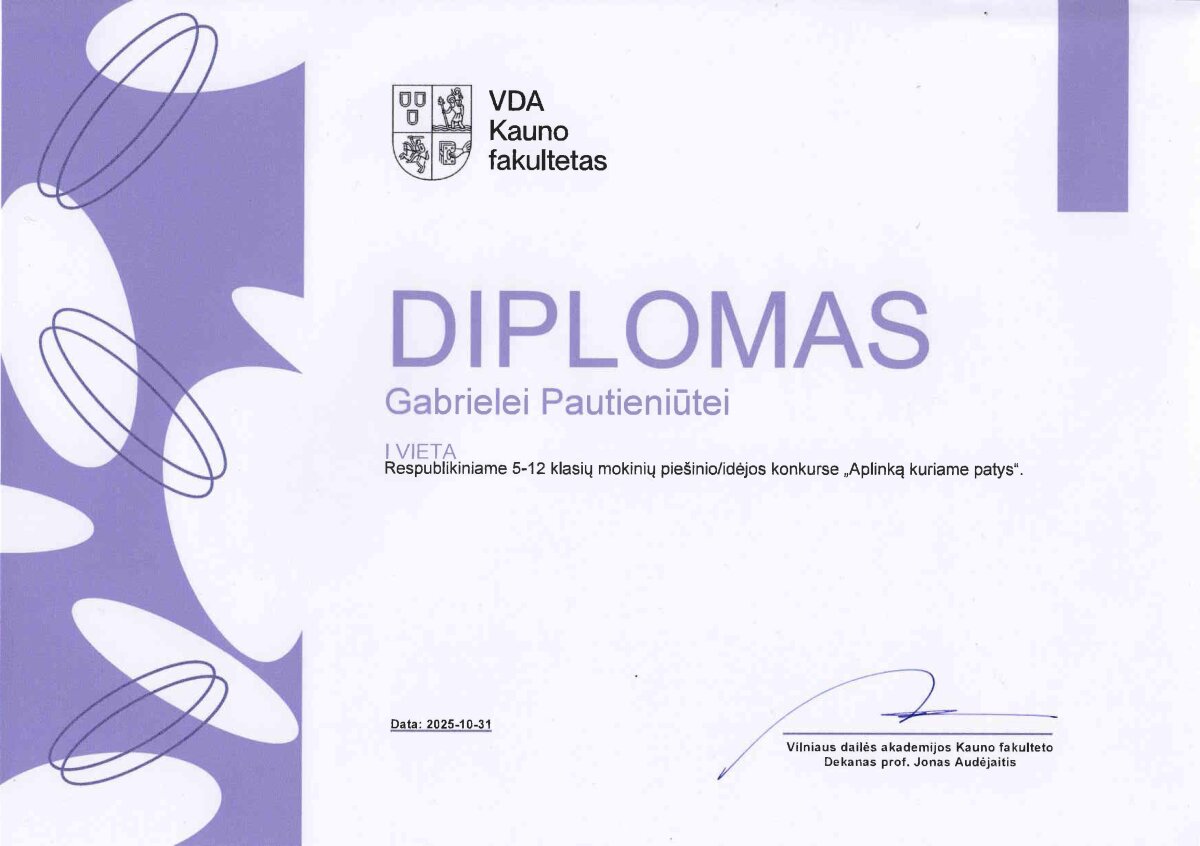 Vilniaus dailės akademijos (VDA) Kauno fakultetas jau septintąjį kartą organizavo respublikinį dailės konkursą 5–12 klasių mokiniams. Mūsų mokiniai jame dalyvavo ketvirtą kartą. Gimnazijai atstovavo 6 klasės mokinė Urtė Karbauskaitė (mokytoja Diana Stelmakovaitė), 7 klasės mokinė Gabrielė Pautieniūtė (mokytoja Justina Šaltė), IIa gimnazijos klasės mokinė Salomėja Petrūnaitė (mokytoja Vilija Lesauskienė) ir IIIb gimnazijos klasės mokinė Liepa Burškaitytė (mokytoja Aida Juškaitė). Konkurso rezultatai netgi pranoko mūsų lūkesčius: Salomėja laimėjo konkurso Grand Prix, jos darbą komisija pripažino geriausiu iš 80 konkurso dalyvių darbų; Gabrielė – I vietą savo amžiaus grupėje, o Liepa – III vietą. Tai didžiulis pasiekimas, žinant, jog konkurso komisija itin reikli ir kompetentinga: pirmininkas – prof. Jonas Audėjaitis (VDA Kauno fakulteto dekanas), nariai – prof. Virgilijus Trakimavičius (grafikos dizaineris, VDA Kauno fakulteto Dizaino katedros vedėjas), doc. Rimantas Giedraitis, (architektas, VDA Kauno fakulteto Architektūros katedros vedėjas, Rebeka Bruder (tapytoja, Kauno dailininkų sąjungos Kauno skyriaus pirmininkė), Danguolė Lunskienė (Kauno dailės gimnazijos dailės mokytoja metodininkė).