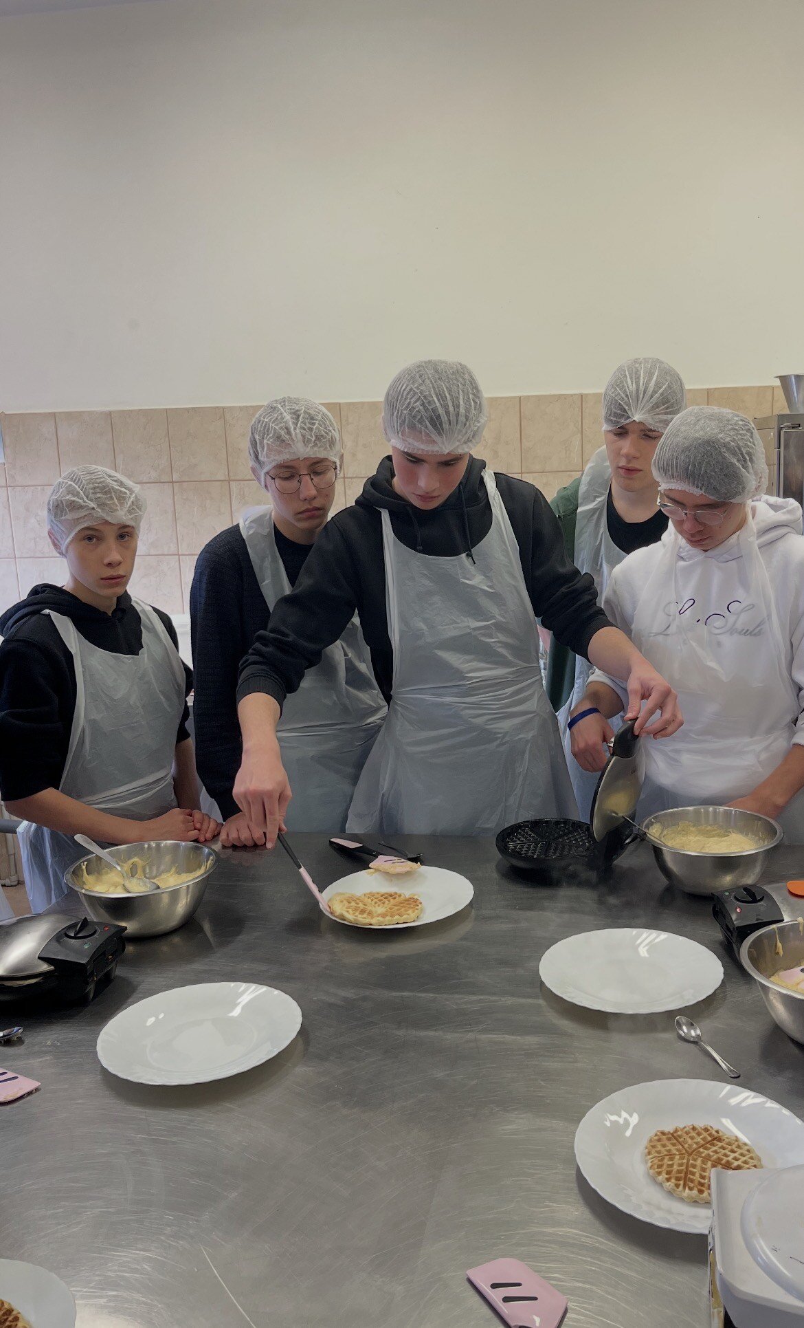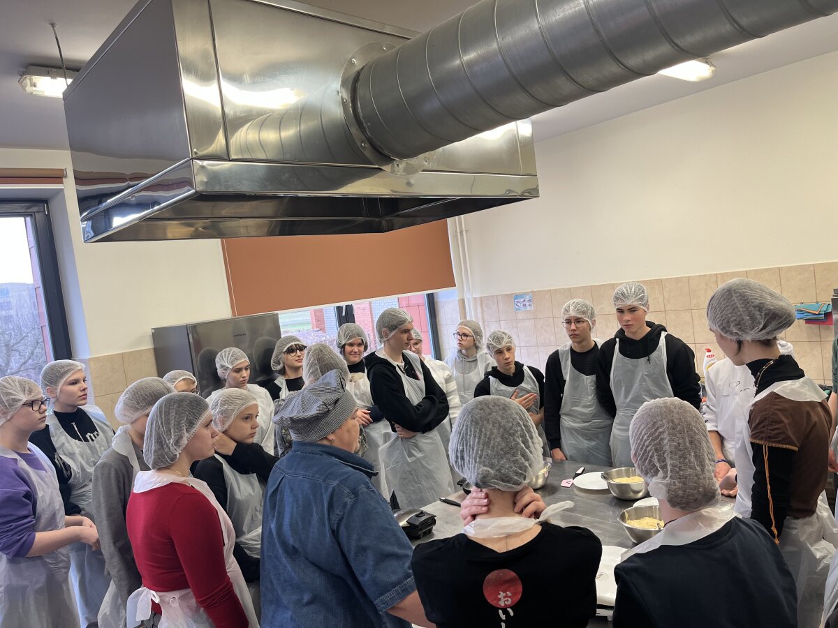 Pamokos metu mokiniai kepė ir ragavo blynus, išbandydami praktinius maisto ruošimo įgūdžius realioje mokymosi aplinkoje. Apsilankymas suteikė galimybę geriau suprasti maitinimo sektoriaus darbo specifiką ir profesines galimybes.
