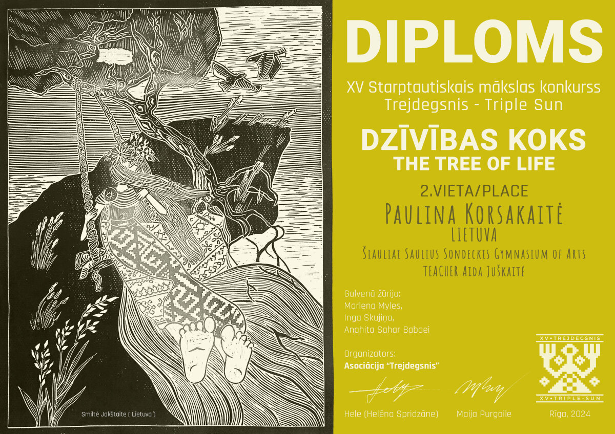 Latvijos sostinėje Rygoje jau penkioliktąjį kartą vyko tarptautinis dailės konkursas „Trejdegsnis. Triple Sun“, kurį organizuoja Latvijos dailininkė Maija Purgaile. Šiemetinė jo tema buvo „Gyvybės medis“. Konkurse dalyvavo 391 mokinys iš 8 šalių: Latvijos, Lietuvos, Indijos, Hong Kongo, Bulgarijos, Argentinos, Tailando ir Vietnamo. Darbus vertino kompetentinga 8 narių komisija iš trijų šalių.