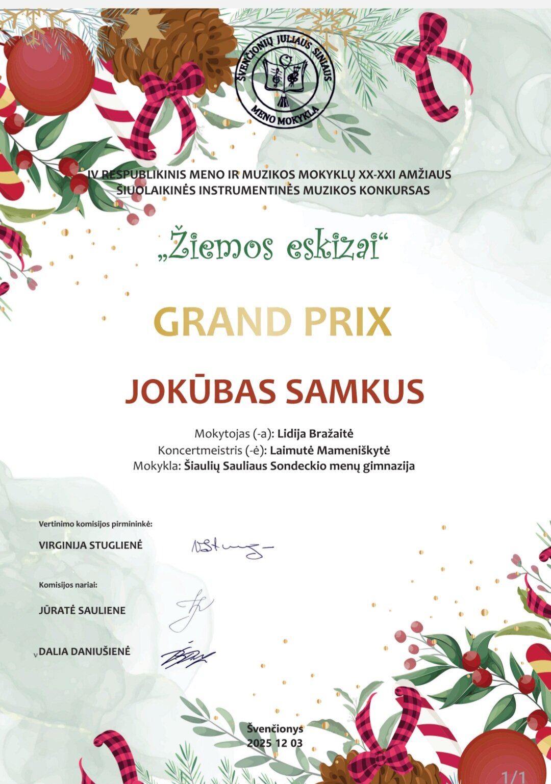 Puikus gimnazijos 8 klasės violončelininko Jokūbo Samkaus įvertinimas IV respublikiniame meno ir muzikos mokyklų XX–XXI amžiaus šiuolaikinės instrumentinės muzikos konkurse „Žiemos eskizai“. Gruodžio 3 dieną konkursą organizavo Švenčionių Juliaus Siniaus meno mokykla. Jis vyko mišriu būdu: gyvai ir nuotoliu. Jokūbas jau ne pirmą kartą jame dalyvauja. Šįkart mokinys buvo įvertintas pačiu aukščiausiu Grand Prix apdovanojimu. Du Grand Prix per 2025 metus vainikuoja šio nuostabaus jaunojo violončelininko tobulėjimą. Jo mokytoja Lidija Bražaitė, koncertmeisterė Laimutė Mameniškytė.