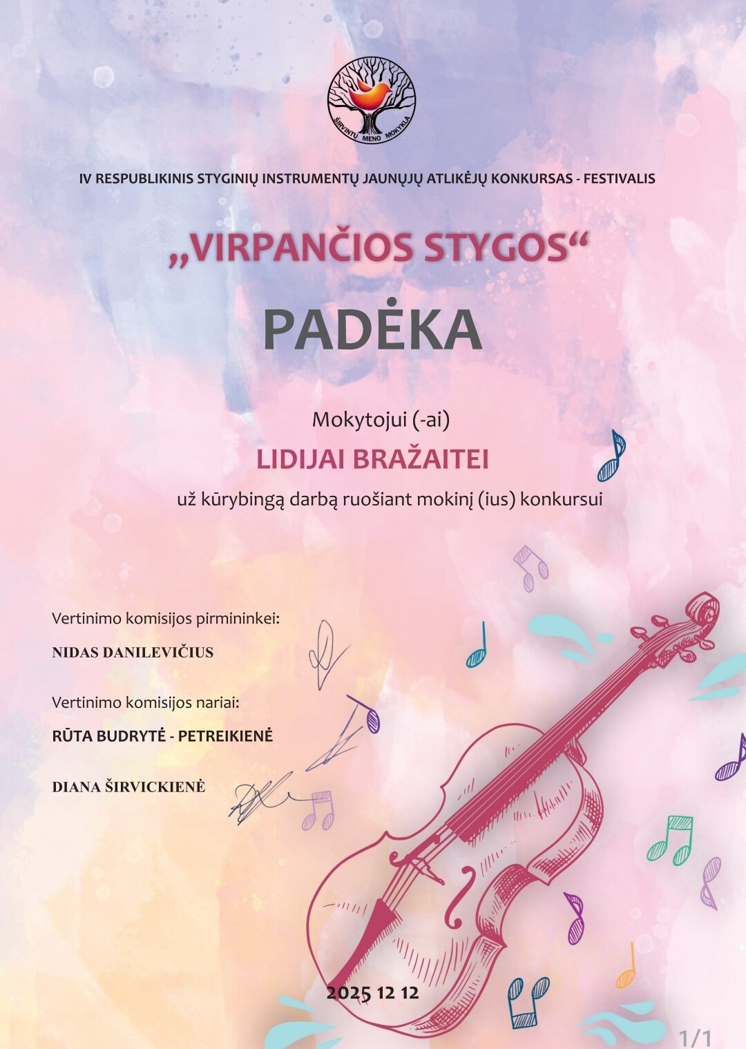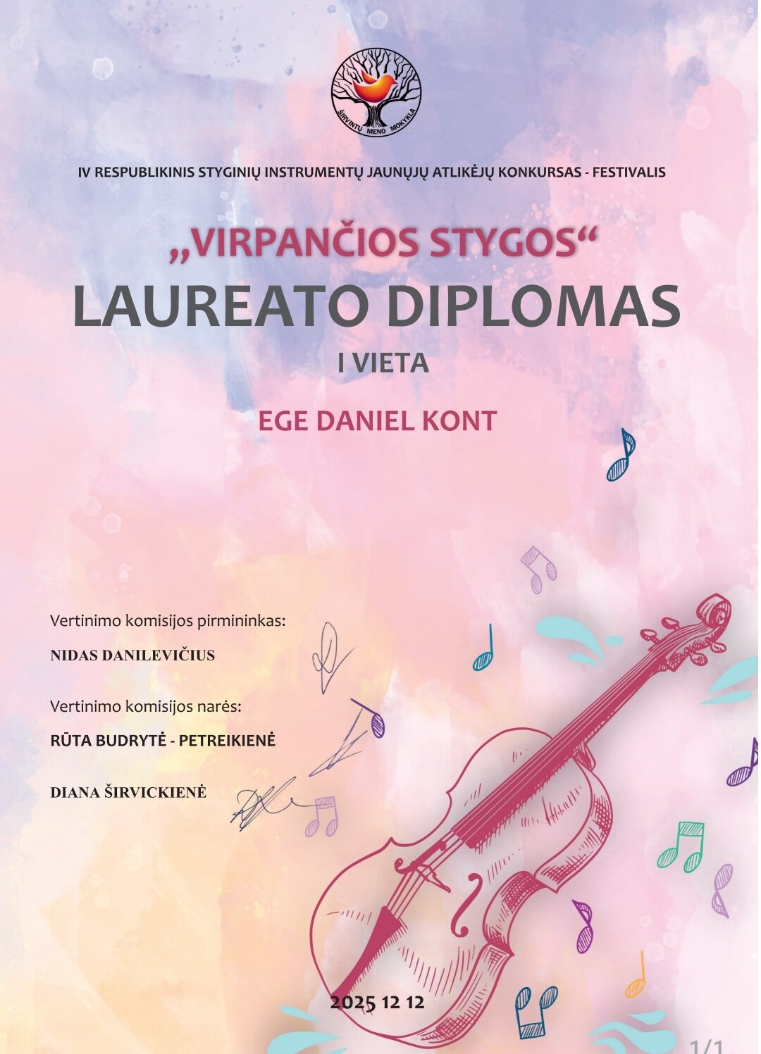 Tikra kalėdinė dovana atskriejo mūsų gimnazijos 5 klasės violončelininkui Egei Daniel Kont. Laimėtas I vietos laureato diplomas IV respublikiniame styginių instrumentų konkurse-festivalyje „Virpančios stygos“. Konkursą gruodžio 12 dieną mišriuoju būdu organizavo Širvintų meno mokykla. Nuoširdžiai abu su Ege dėkojame koncertmeisterei Liudmilai Filimonenko už pagalbą, ruošiantis konkursui.