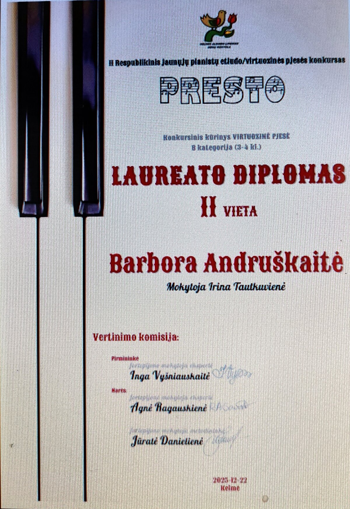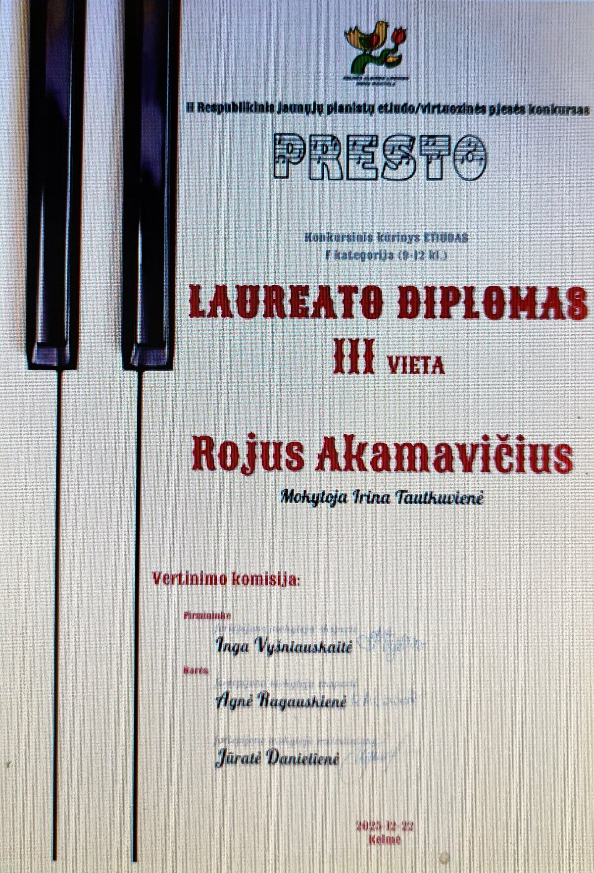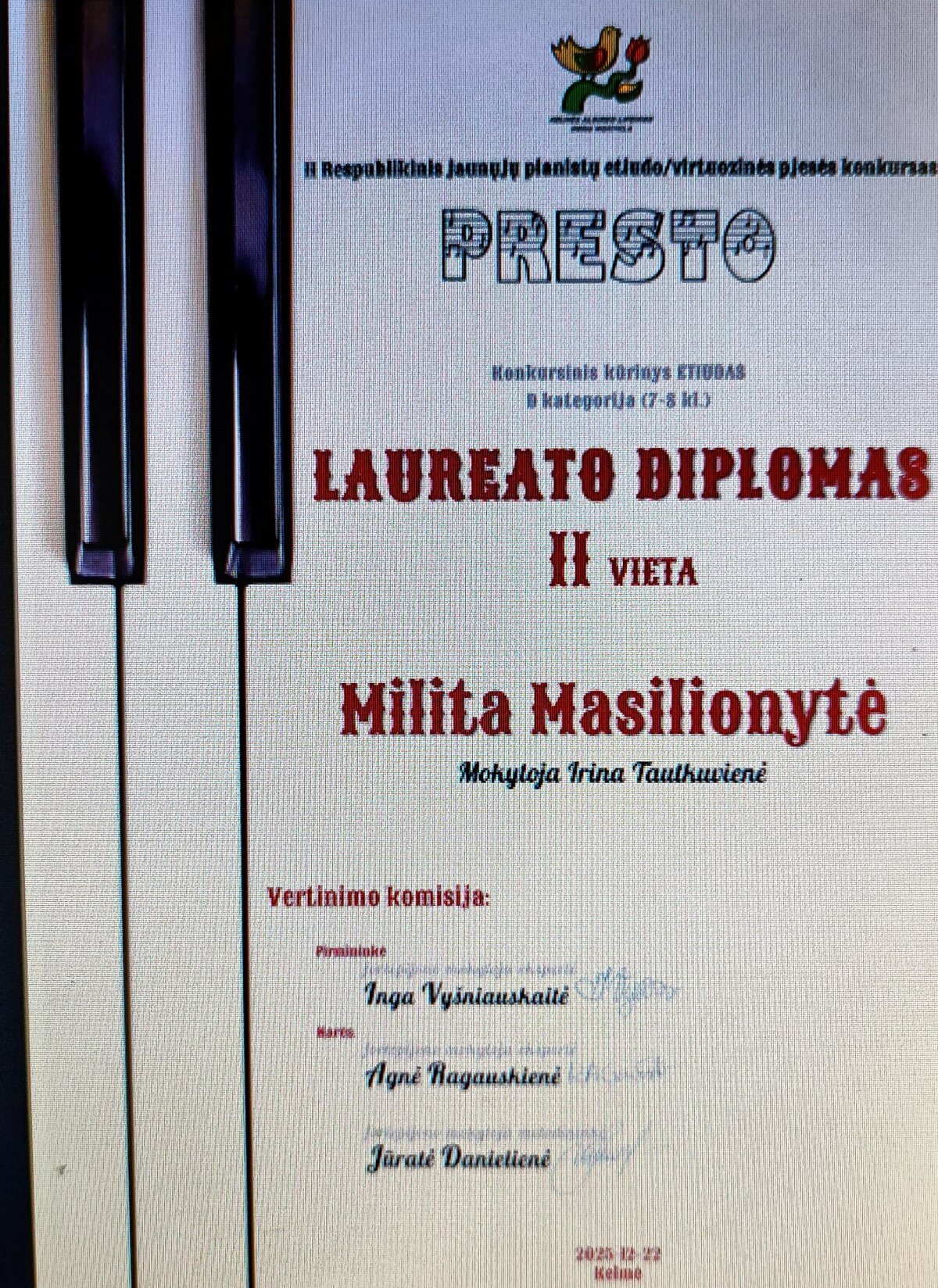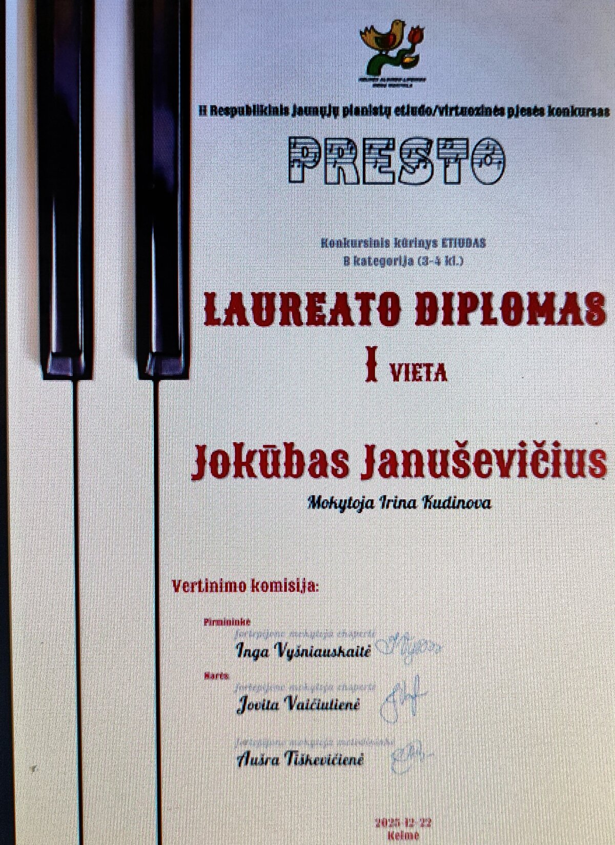 Gruodžio 22 d. keturi Šiaulių Sauliaus Sondeckio menų gimnazijos pianistai puikiai pasirodė II respublikiniame jaunųjų pianistų etiudo / virtuozinės pjesės konkurse „PRESTO 2025“. Virtualų konkursą organizavo Kelmės Algirdo Lipeikos menų mokykla.