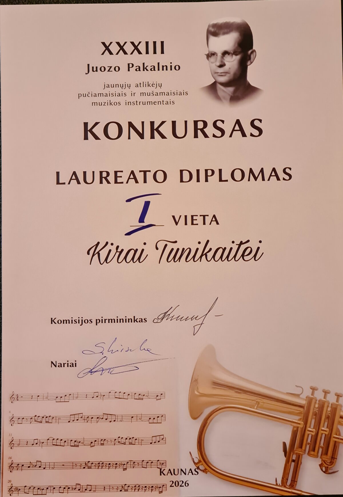Laimėjimas XXXIII Juozo Pakalnio respublikiniame jaunųjų atlikėjų pučiamaisiais ir mušamaisiais instrumentais konkurse