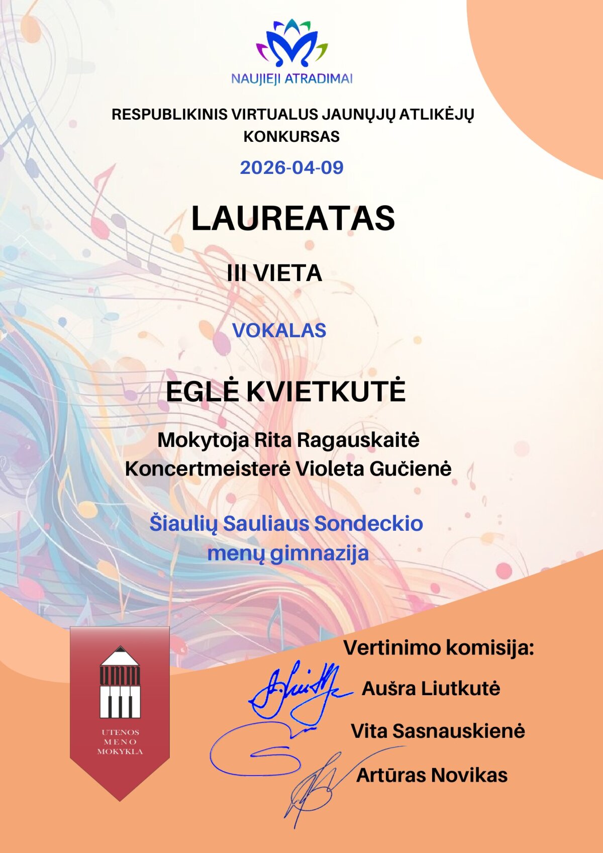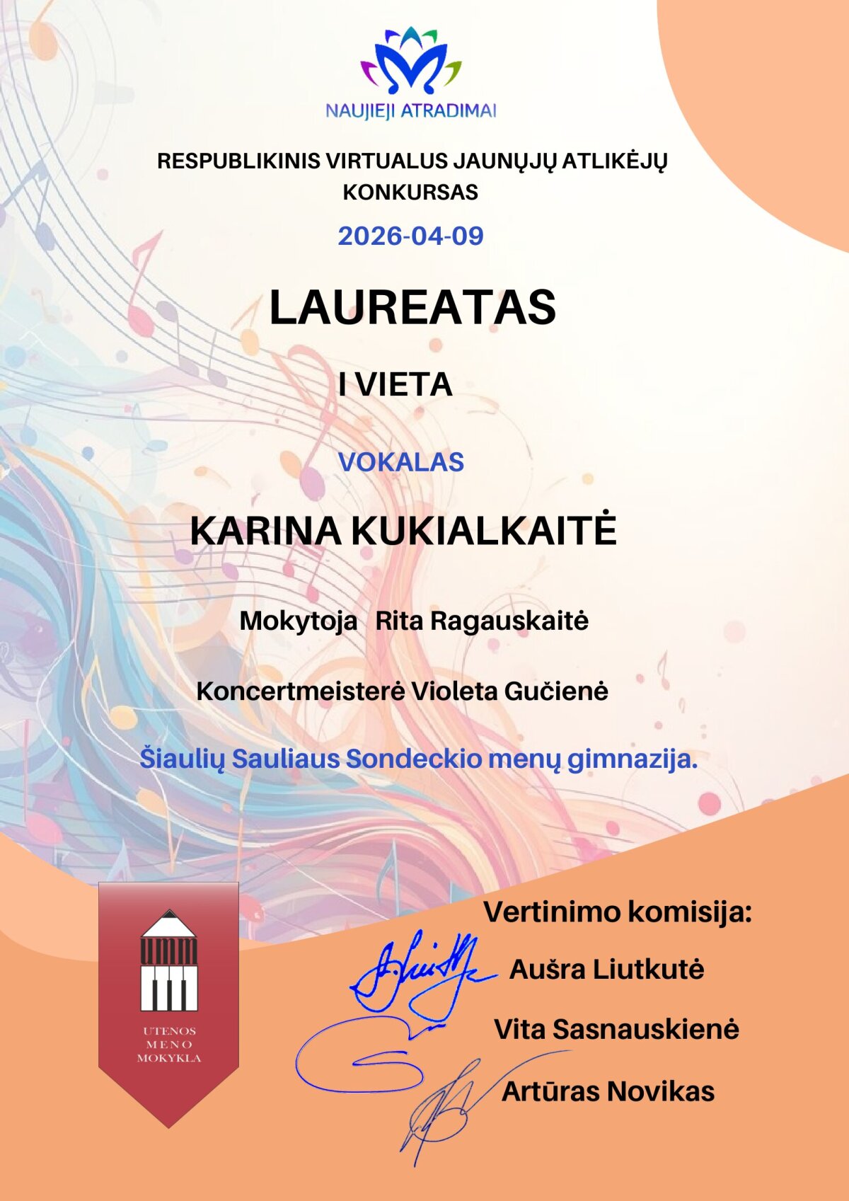 Balandžio 9-ąją baigėsi virtualus konkursas ,,Naujieji atradimai 2026“, kurį organizavusi Utenos meno mokykla nuoširdžiai dėkojo visiems jauniesiems Lietuvos atlikėjams ir jų mokytojams už aktyvų dalyvavimą bei įsimintinus, kūrybiškus pasirodymus.