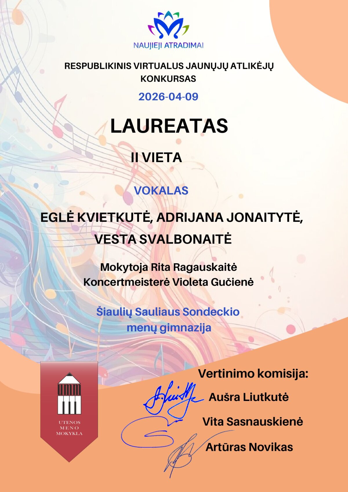 Džiaugiamės ir sveikiname mūsų gimnazijos 1–4 klasių mokines, puikiai pasirodžiusias konkurse: Kariną Kukialkaitę, Patriciją Augustinaitę, Gabrielę Juškaitę, Eglę Kvietkutę, Adrijaną Jonaitytę ir Vestą Svalbonaitę. Mergaitės pelnė garbingus pirmų, antrų ir trečių vietų laureato diplomus. Konkursui jas paruošė atlikėjo raiškos mokytoja Rita Ragauskaitė ir koncertmeisterė Violeta Gučienė.