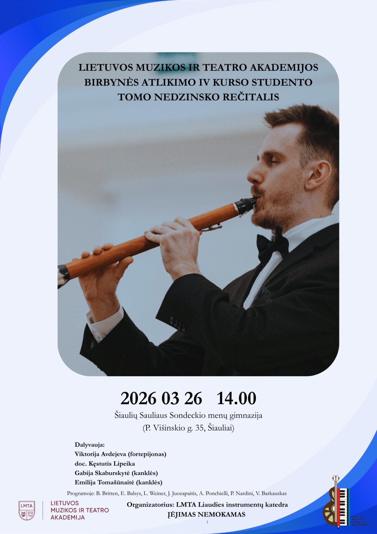Kovo 26 d. 14.00 val. LMTA birbynės atlikimo IV kurso studento Tomo Nedzinsko rečitalis