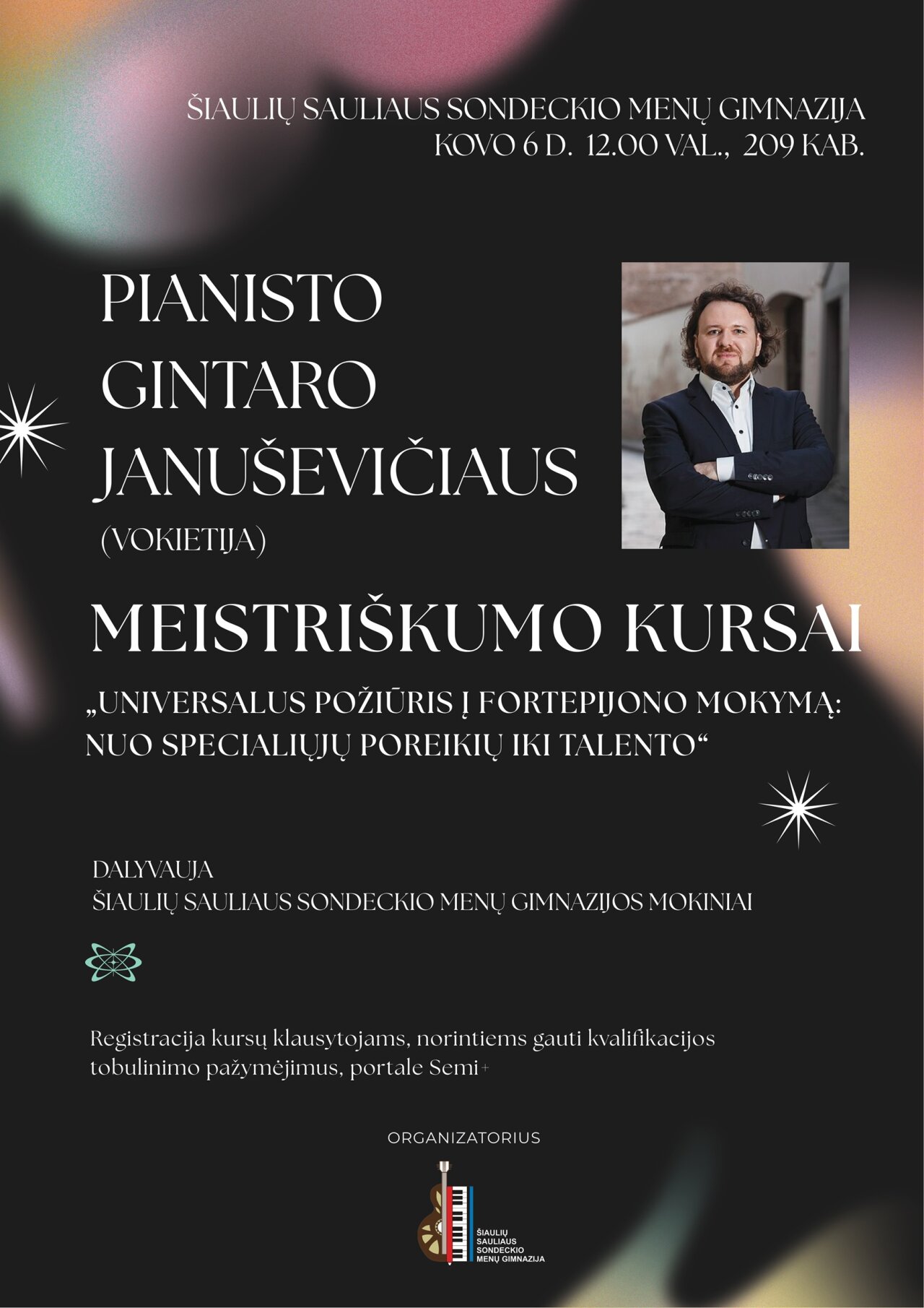 Kovo 6 d. 12.00 val. gimnazijoje vyks meistriškumo kursai, kuriuos ves charizmatiškasis pianistas Gintaras Januševičius (Vokietija)