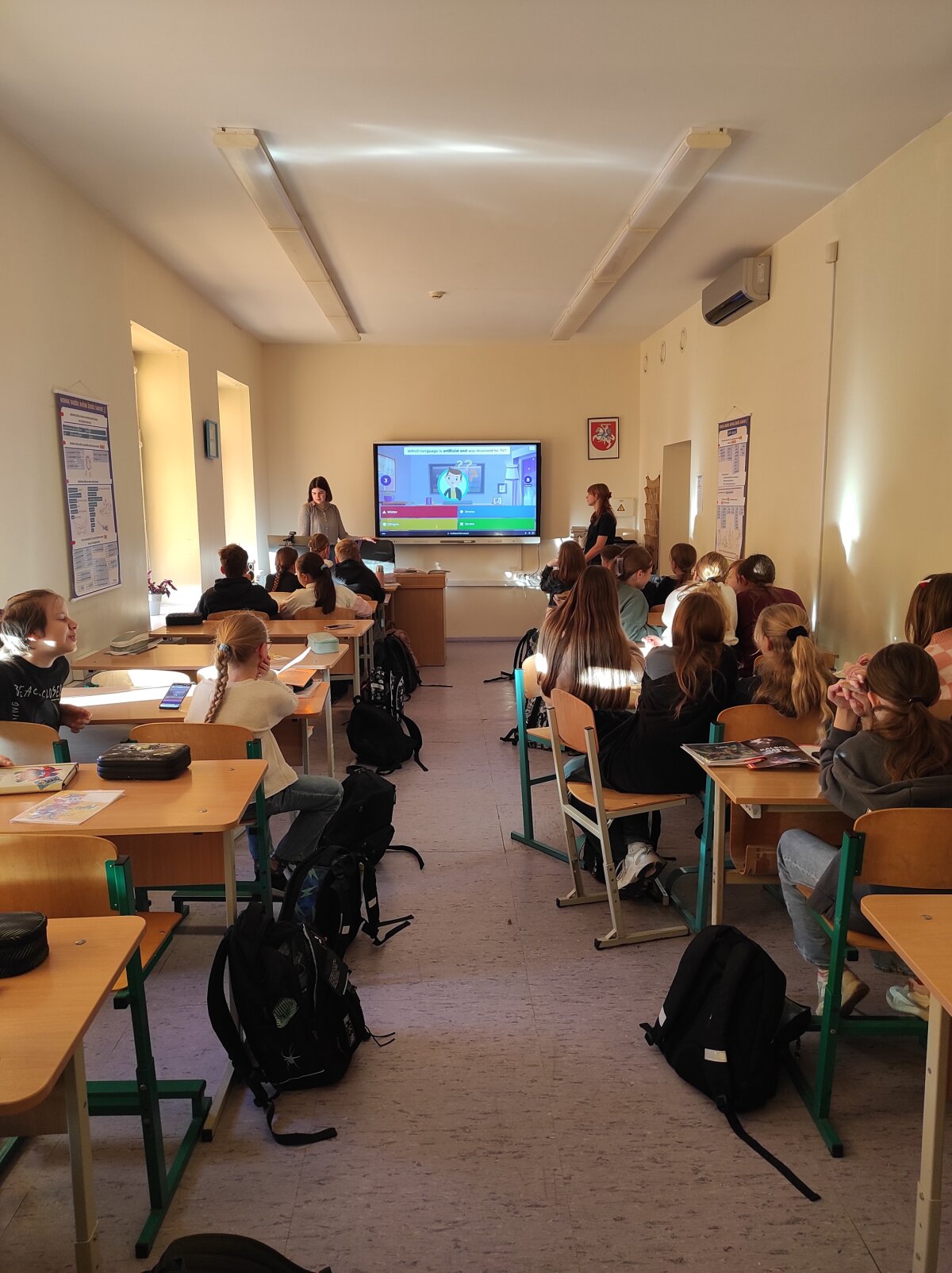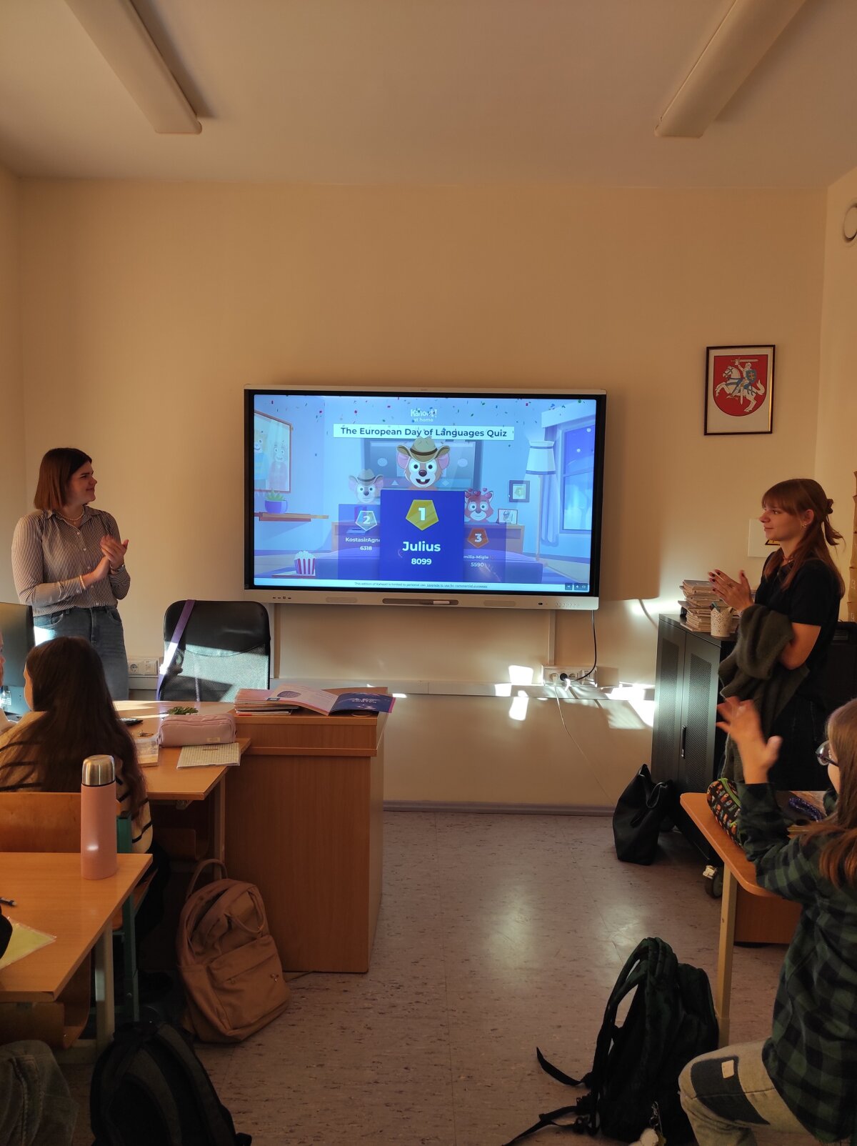 Rugsėjo 26 dieną pas penktokus lietuvių kalbos ir literatūros pamokoje apsilankė IIIb gimnazijos klasės mokinės Liepa ir Emilija. Merginos pristatė Kahoot žaidimą apie Europos kalbas.