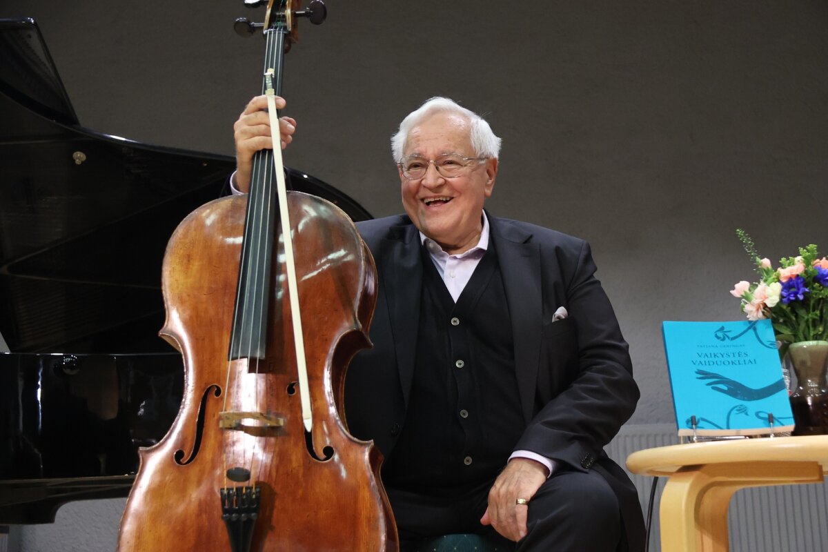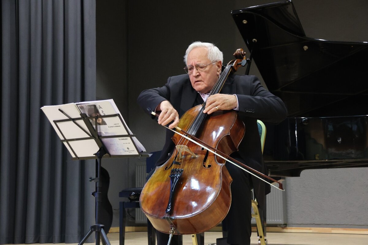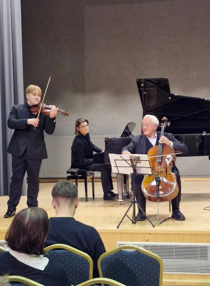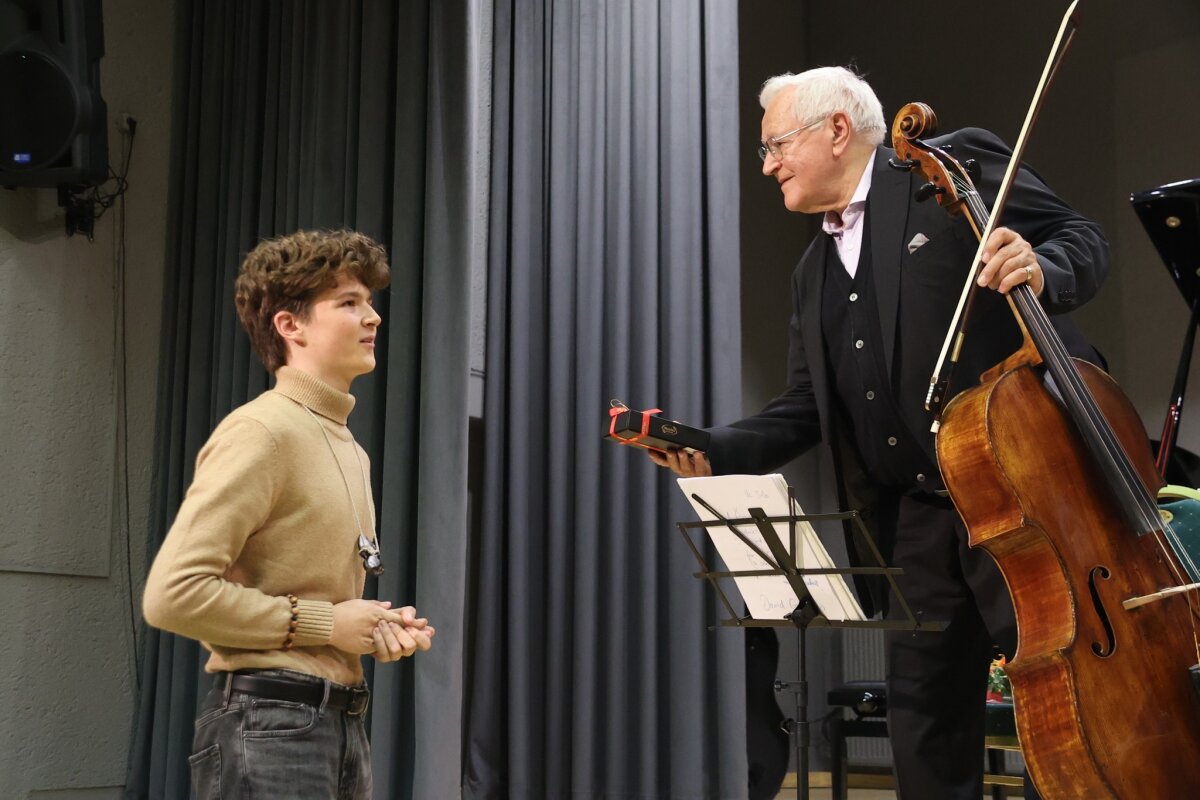 Prof. Davidas Geringas pasidalijo savo gyvenimo akimirkomis, prisiminimais apie savo mokytoją Mstislavą Rostropovičių, Saulių Sondeckį, papasakojo apie savo muzikinį kelią, šeimą, taip pat atliko keletą kūrinių, į vieną iš jų netikėtai įtraukdamas net mūsų gimnazijos mokinius Paulių ir Povilą.