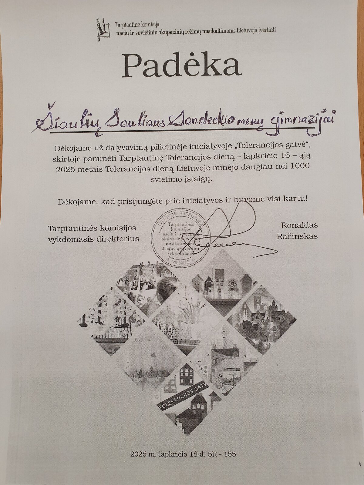 Lapkričio 16-oji yra minima daugelyje demokratinių valstybių nuo 1995 metų, kai UNESCO šią dieną paskelbė Tarptautine tolerancijos diena. Tarptautinė istorinio teisingumo komisija kasmet nuo 2003 metų inicijuoja šios dienos minėjimą. Šiemet šios dienos simbolis – Tolerancijos gatvė. Mūsų gimnazijoje visą savaitę (17–21 dienomis) mokiniai ir mokytojai skyrė daugiau dėmesio tolerancijos temai.