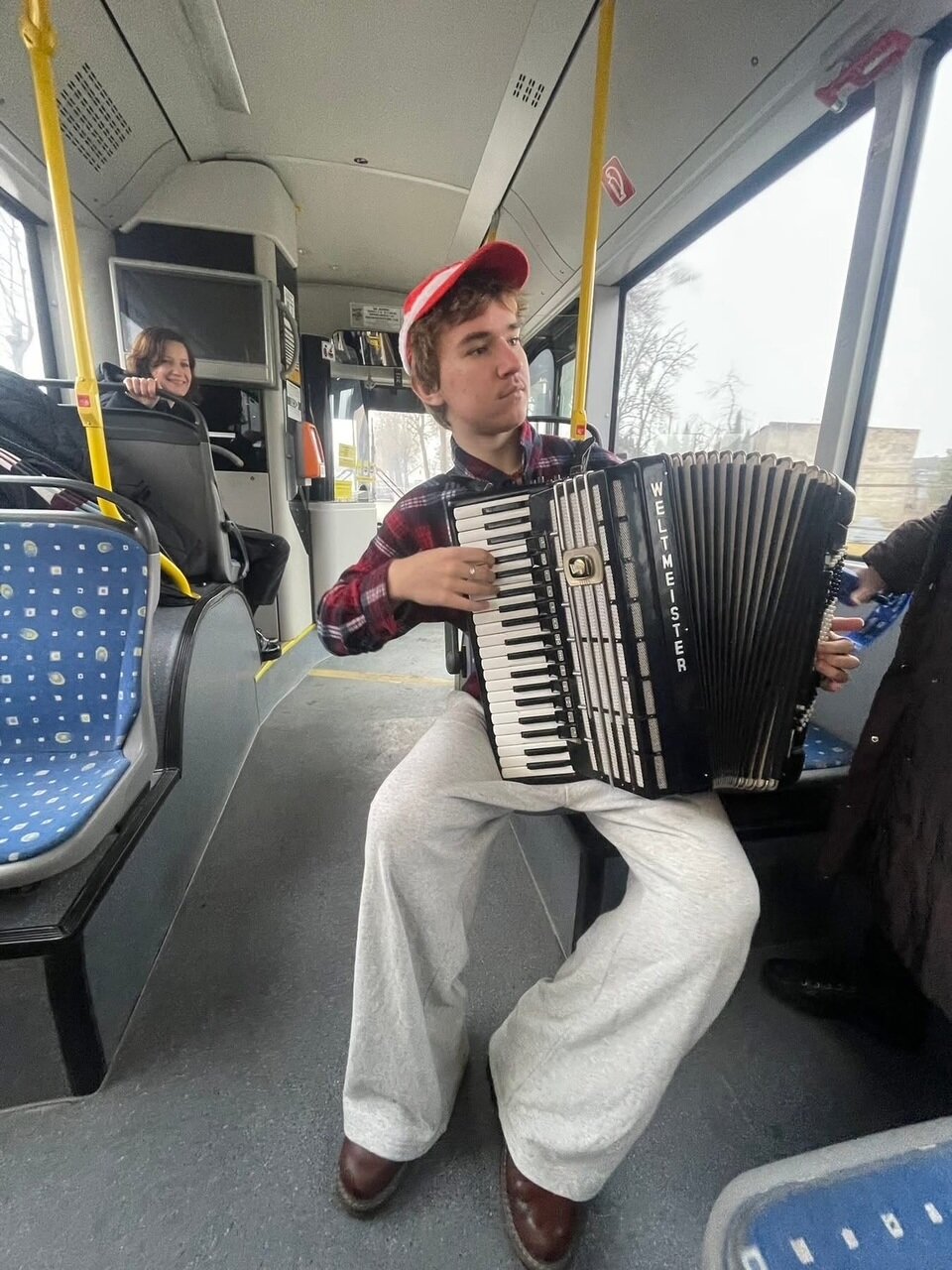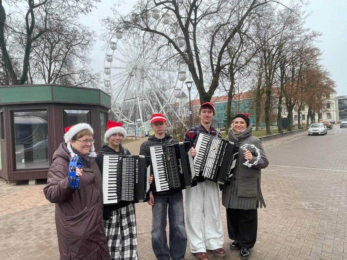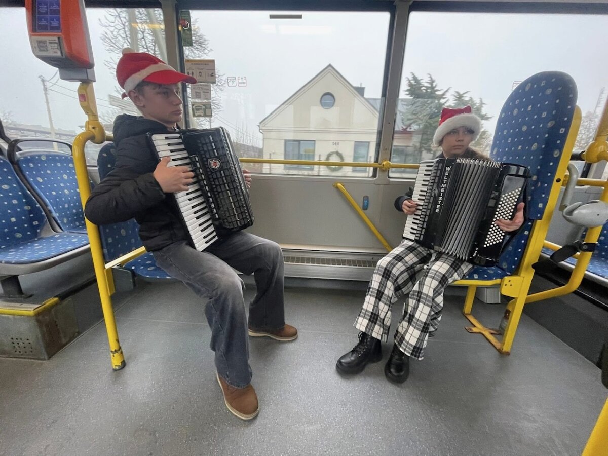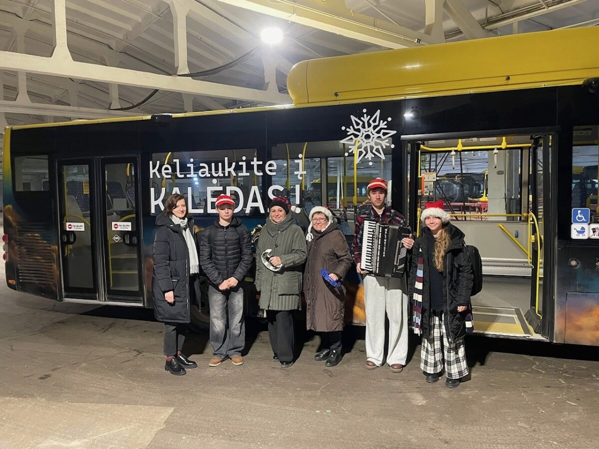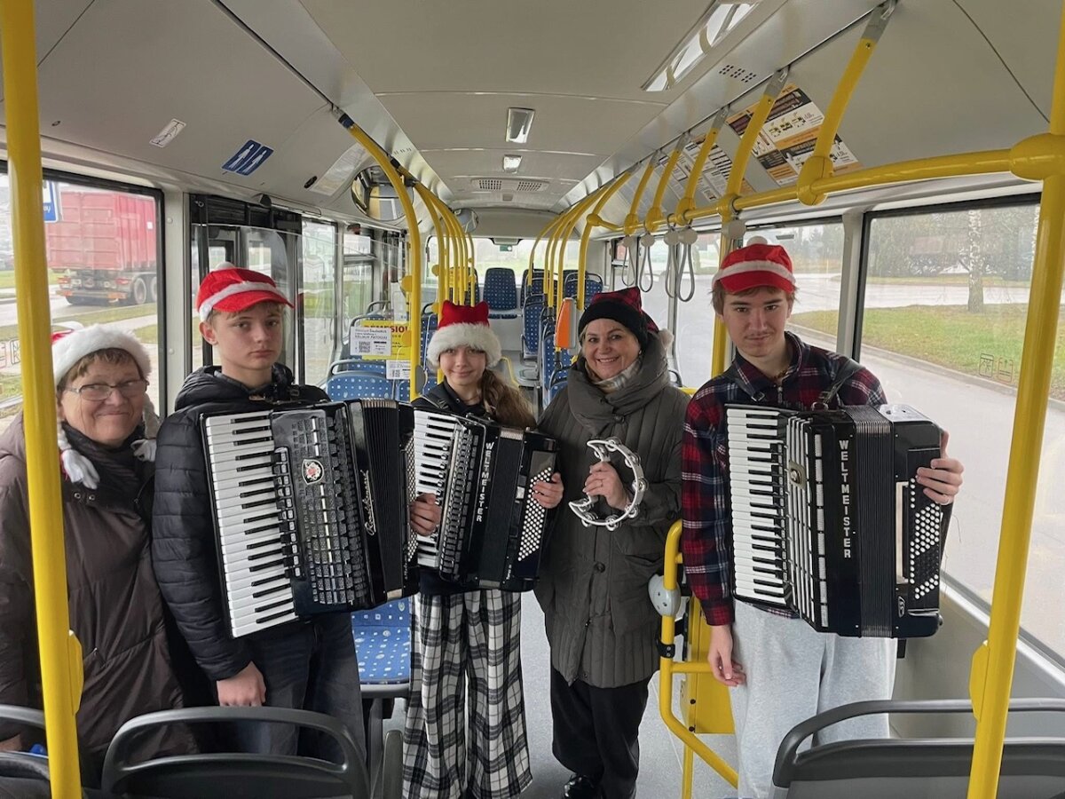 Tik nuskambėjus akordeono metodinės grupės renginiui, gruodžio 18 dieną jau skubėjome į 7 autobuso maršruto galinę stotelę, aplankėme ir autobusų parko garažą. Ten spėjome pamatyti, kaip mūsų miesto transportas ruošiamas maršrutams, susiradome papuoštą autobusą ir patogiai įsikūrėme jame. Mus vežė vairuotoja – Kalėdų senio padėjėja. Kiekvienoje stotelėje keleivius pasveikinome su kalėdinė melodija, o tarp stotelių muzikavome po vieną, po du ir visi kartu. Skambėjusi muzika kūrė šventinę nuotaiką, žmonės dainavo, šypsojosi, netgi šoko. Turėjome galimybę pasveikinti ir kontrolierių komandą, visiems labai patiko jų nuotaika, išgirdus skambant „Kalėdų varpelius“. Jauniesiems akordeonistams Adrijai Bieliūnaitei, Aleksui Katkui ir Adrijui Balčiūnui bei jų mokytojoms Daivai Vasauskienei ir Marytei Markevičienei keleiviai negailėjo gražių padėkos žodžių, aplodismentų, pavaišino saldumynais.