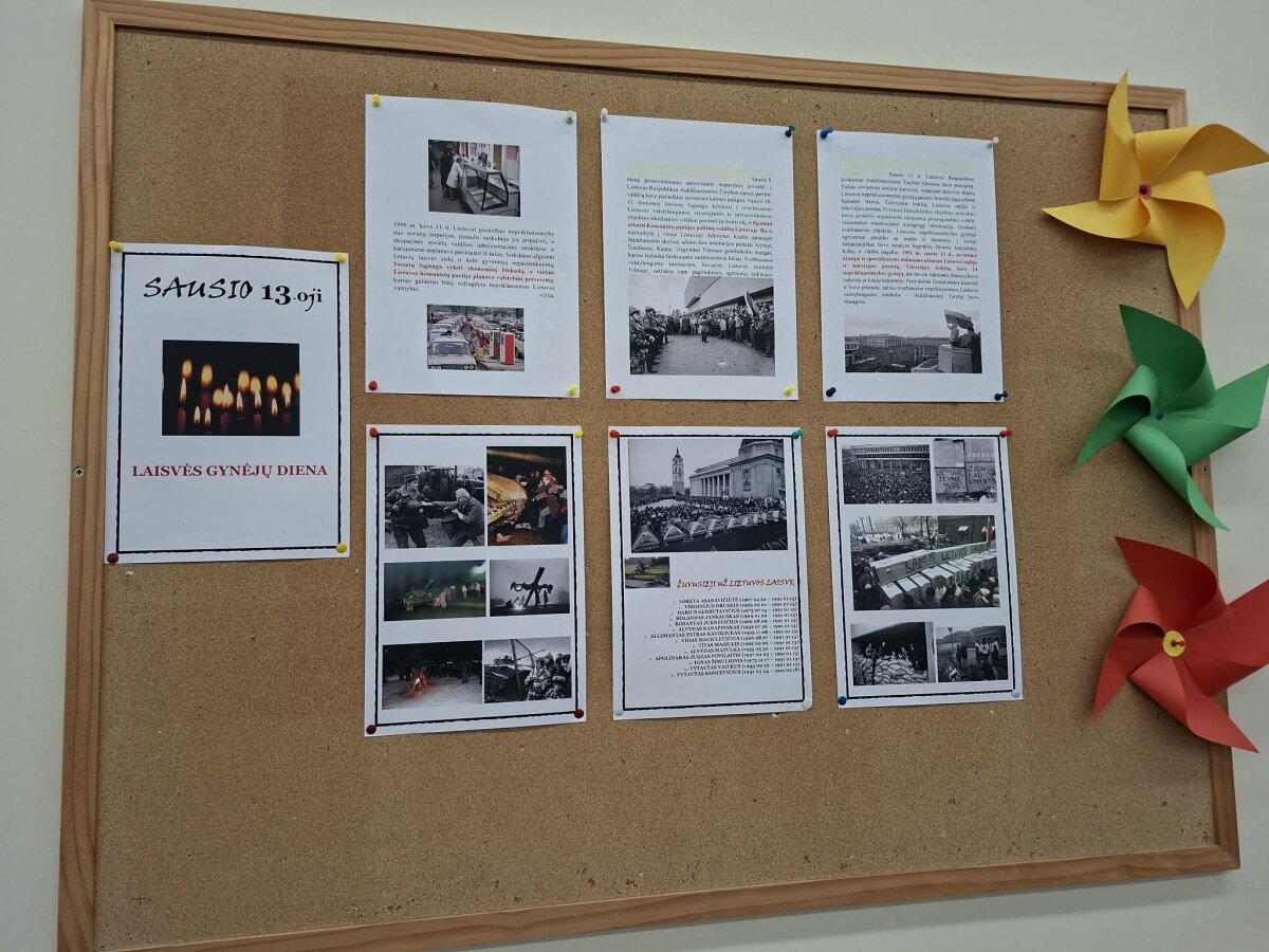 Per istorijos ir kitų dalykų pamokas su mokiniais buvo kalbėta apie Lietuvos laisvę, žmonių patriotiškumą, dalintasi prisiminimais. Mokiniai piešė piešinius, skirtus Sausio 13-ajai atminti. Piešiniuose vaizdavo laužus, vėliavas, televizijos bokštą, taip geriau suprasdami mūsų šalies istoriją ir jos svarbą.