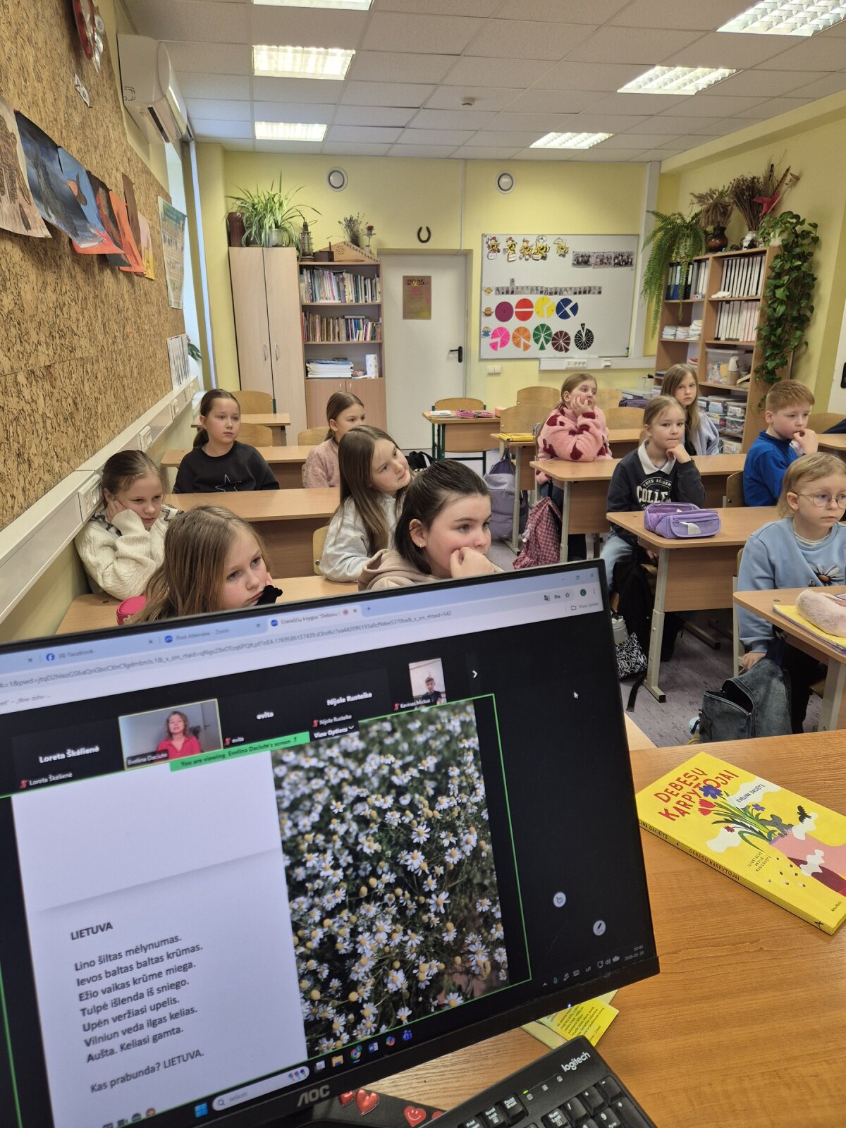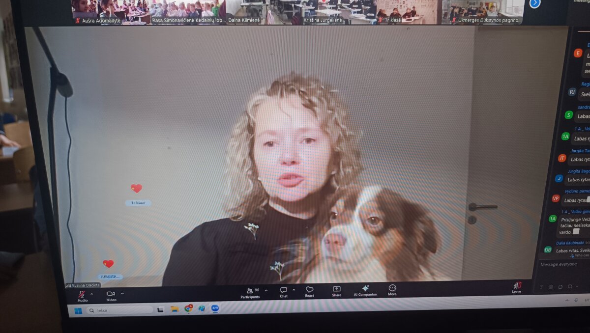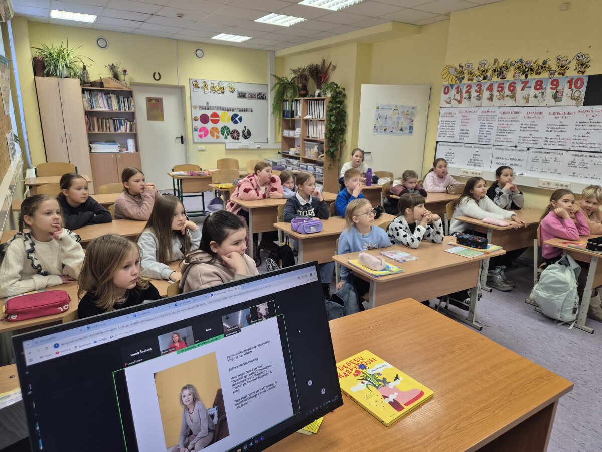 Pirmos ir trečios klasių mokiniai turėjo labai įdomią lietuvių kalbos pamoką. Jie dalyvavo virtualiame rašytojos Evelinos Daciūtės knygos „Debesų karpytojai“ pristatyme. Rašytoja išleido 17 knygų vaikams. Knygos „Laimė yra lapė“, „Drambliai ėjo į svečius“, „Pasakojimas apie katiną ir tulpę“, „Ševeliūra“ ir „Duobė“ yra išverstos į daugiau nei 20 kalbų.