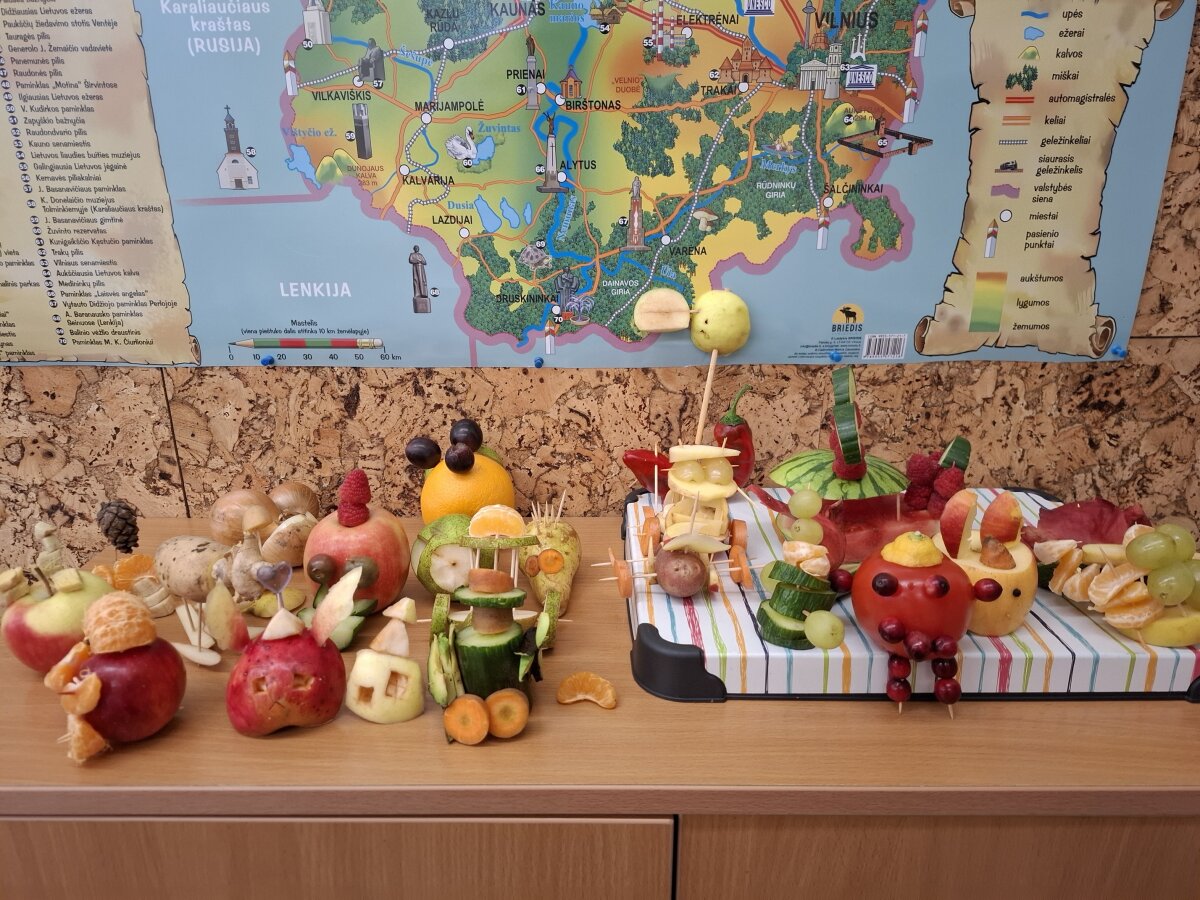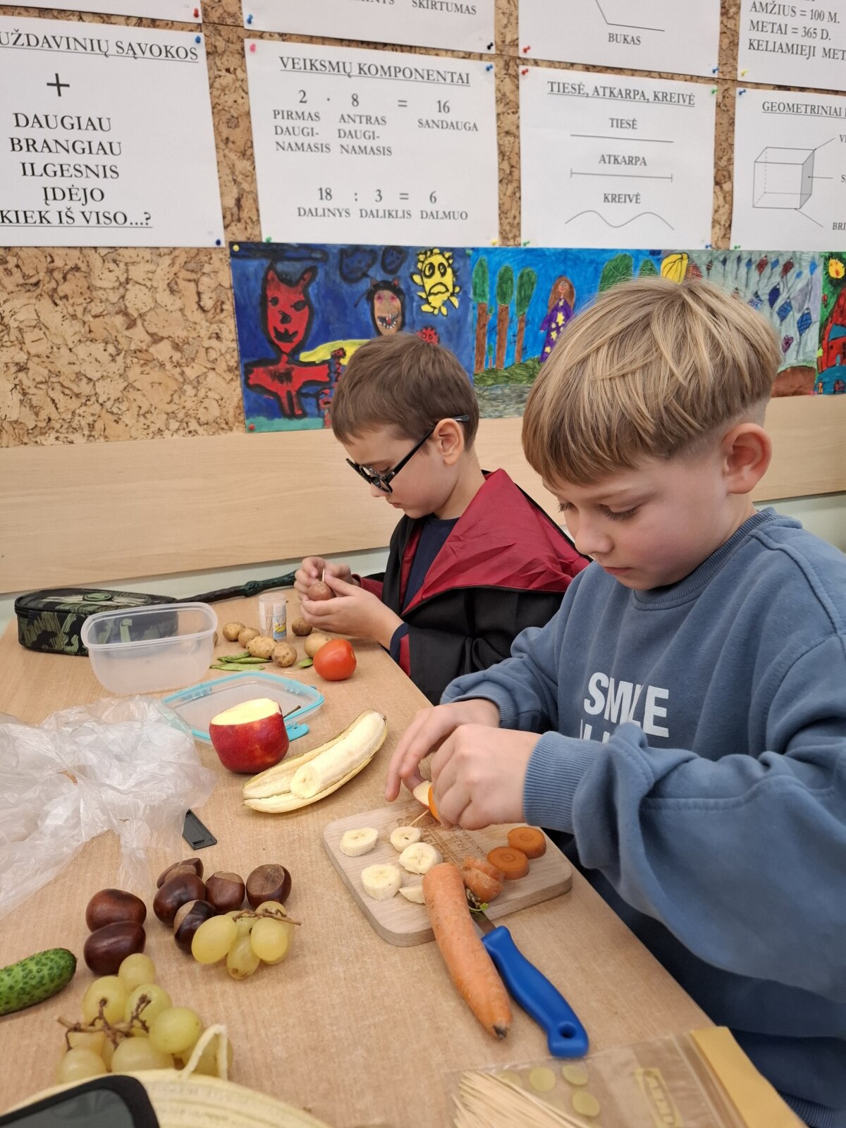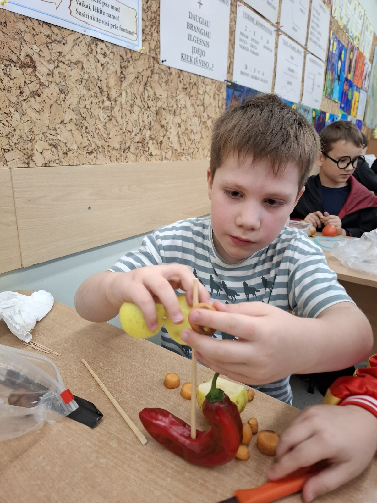 Antros klasės mokiniai minė mįsles apie vaisius, daržoves ir rungėsi, kuris vaikas įmins daugiausia mįslių. Vyko įnirtinga kova. Antrokėliai draugiškai išrinko mįslių karalių ir karalienę. Vėliau vaikai kalbėjo apie daržovių naudą mūsų organizmui. Smagiausia buvo iš vaisių ir daržovių kurti veikėjus ir klasėje surengti parodėlę.