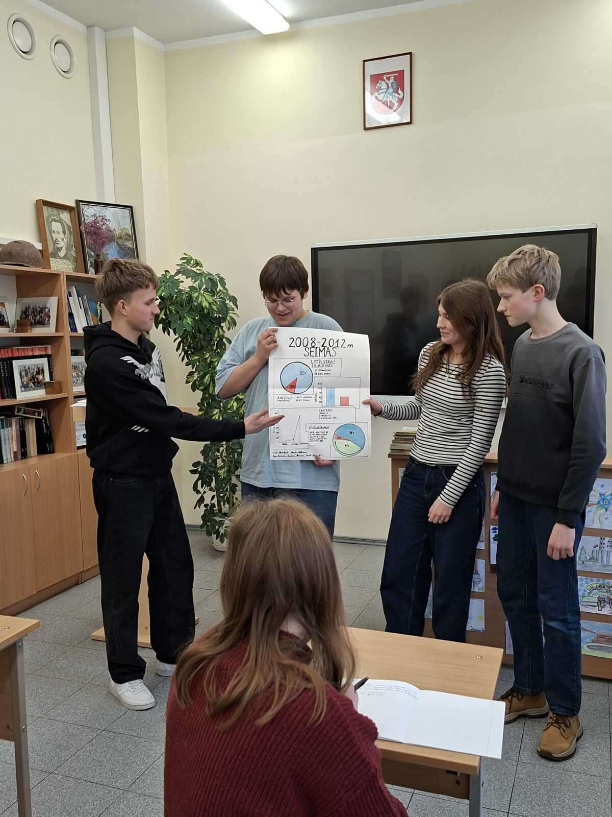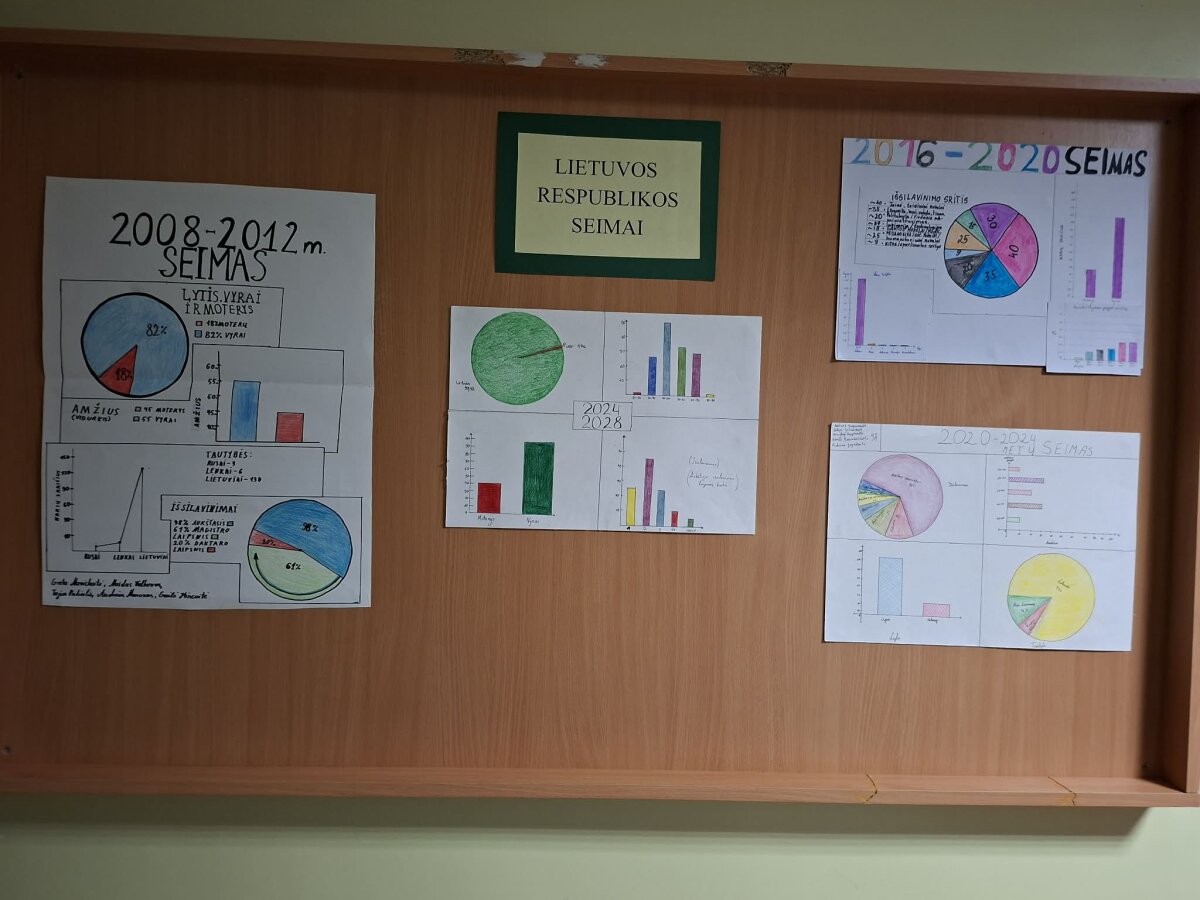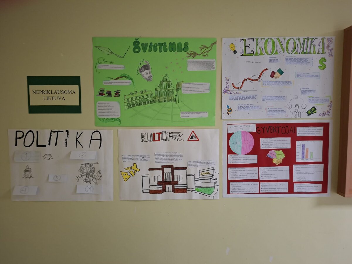 Per pilietiškumo pagrindų pamokas (mokytoja D. Marcišauskienė) I gimnazijos klasių mokiniai rengė projektinius darbus „Lietuvos ūkis, visuomenė, kultūra, švietimas dabar“ bei „Lietuvos seimai“. Su šiais darbais galima susipažinti gimnazijos erdvėse.