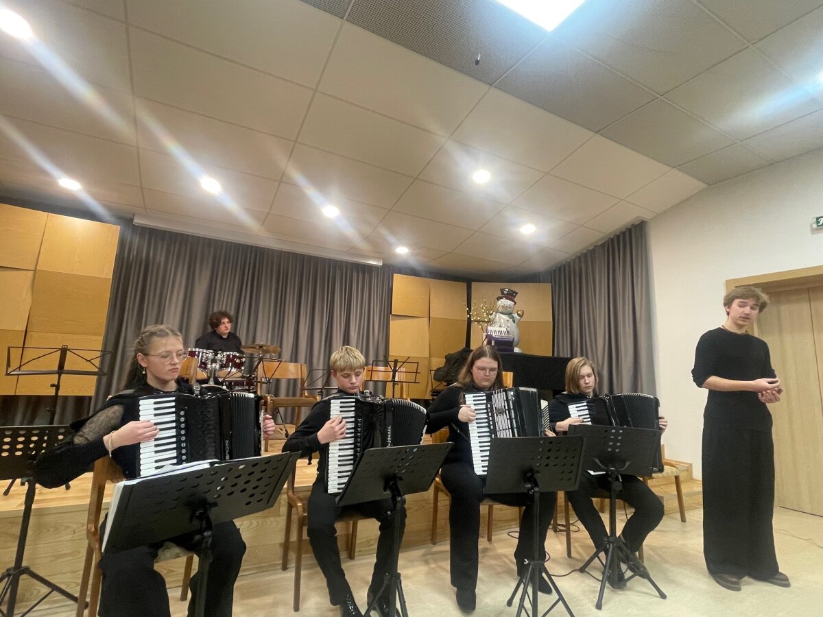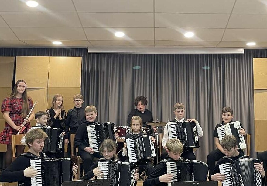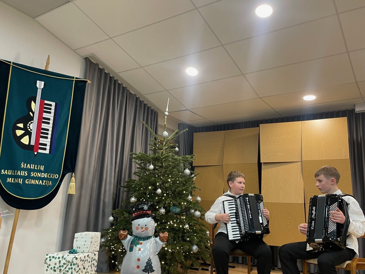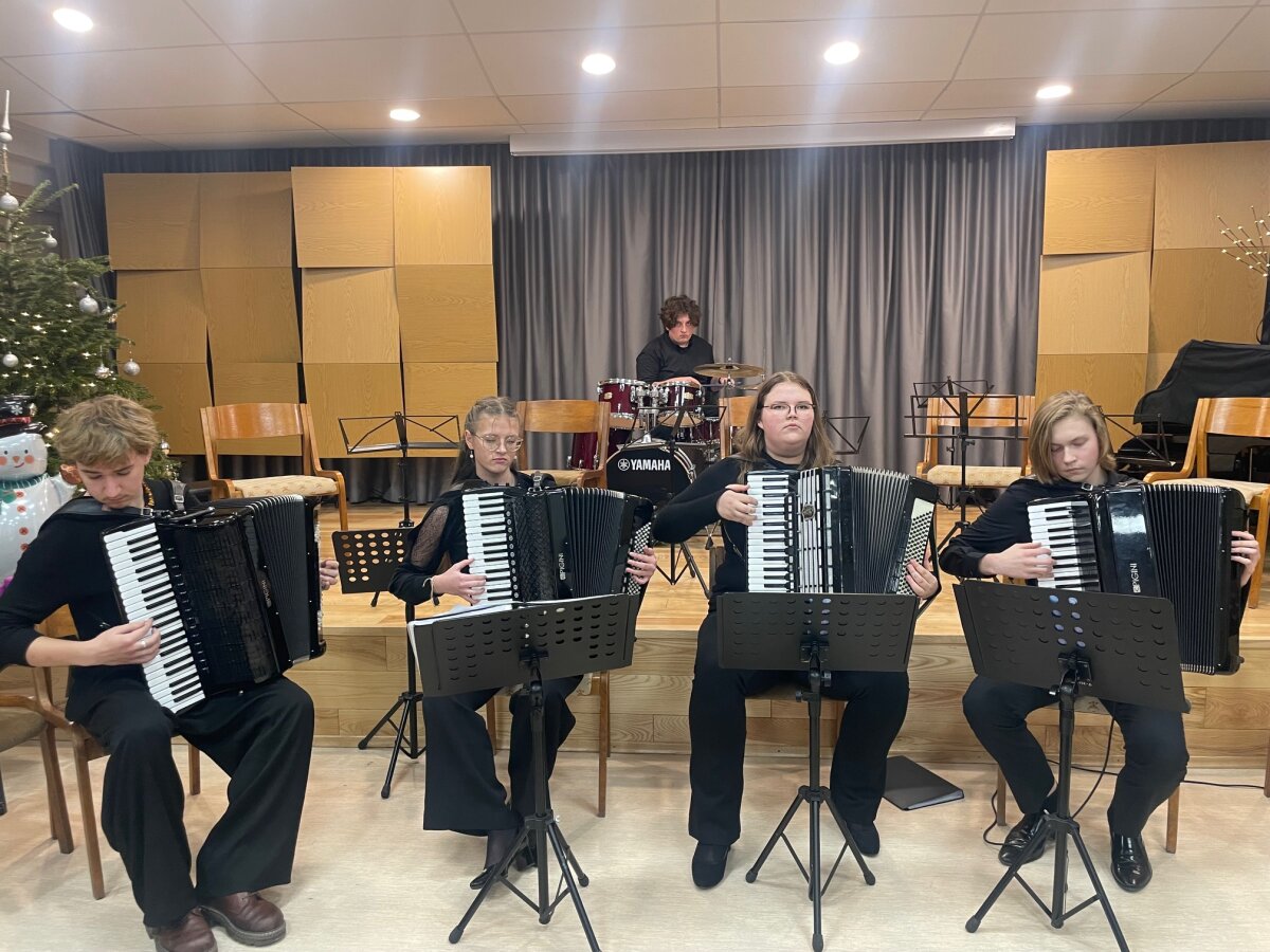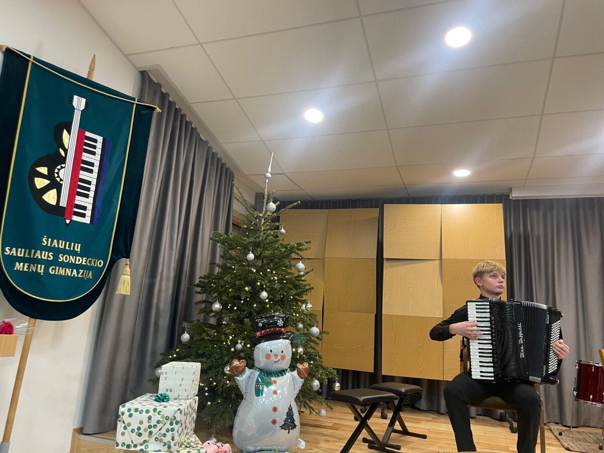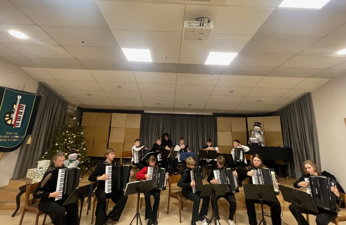 Mūsų gimnazijoje vaikai muzikuoja nuo 1-os iki 12-os klasės, todėl tradiciškai pirmoji į sceną žengė jauniausioji atlikėja – pirmokė Ana. Jos nedrąsūs pirmieji žingsneliai buvo šiltai sutikti klausytojų. Koncertą tęsė vyresnieji pradinukai. Gaila, kad dalis jų šiuo metu serga ir negali nudžiuginti savo artimųjų. Scenoje pasirodė ir visi 5–8 klasių moksleiviai, o pabaigoje – gimnazistai. Kad koncerto trukmė neprailgtų ir visi mokiniai pasirodytų scenoje, muzikavome įvairios sudėties ansambliuose. Džiugu, kad akordeonistai noriai renkasi ir kitus pasirenkamuosius dalykus. Maloniai klausytojus nudžiugino abiturientas Adrijus, atlikęs A. Raudonikio dainą „Meilės elegija“. Koncerto pabaigoje keletą kūrinių pagrojo akordeonistų orkestras. Šiuo metu mūsų nėra daug, tačiau visi vaikai mėgaujasi muzika ir yra laimingi joje.