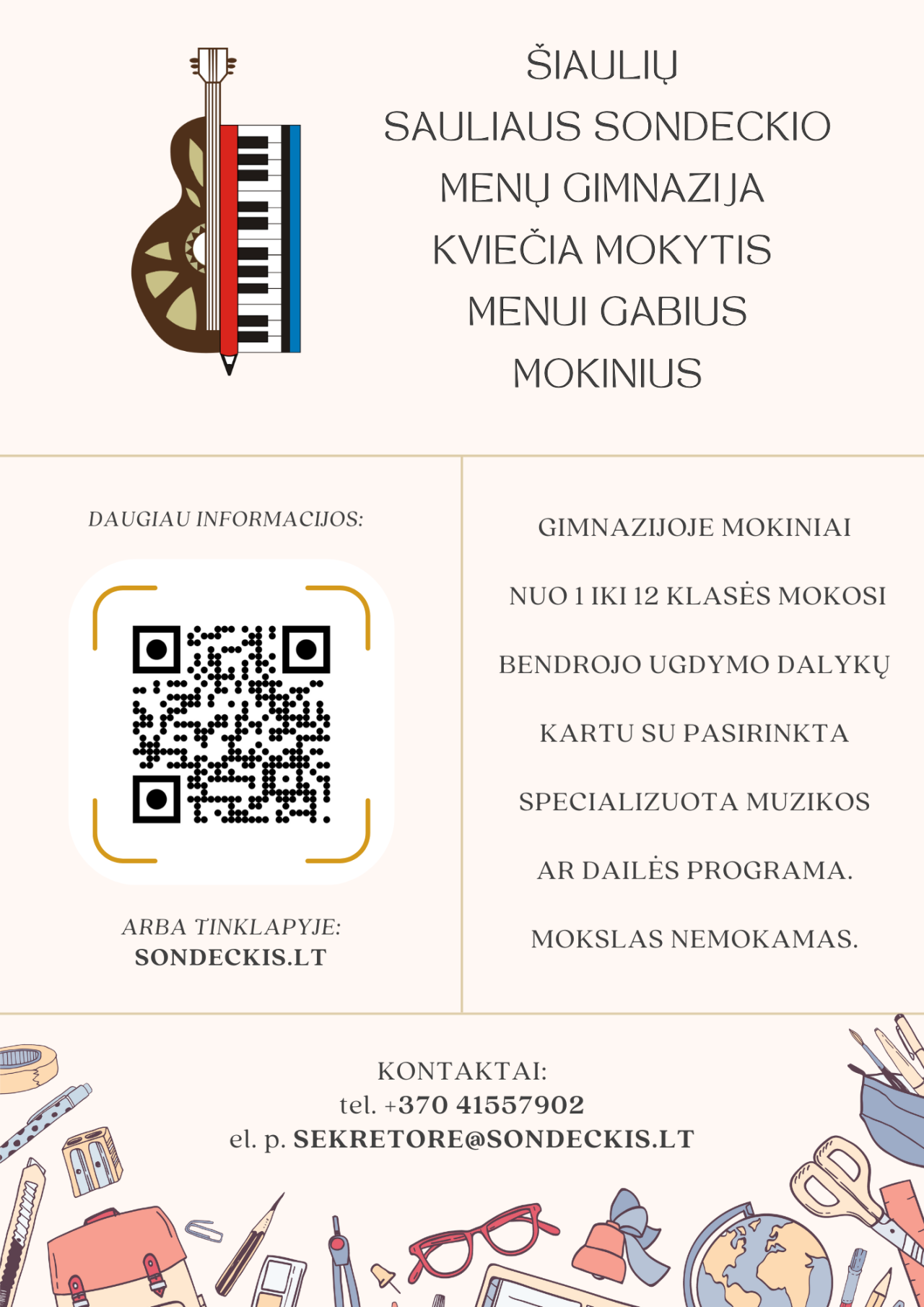 Prašymus dėl priėmimo mokytis galima pateikti (foto ar skenuotą) el. paštu: sekretore@sondeckis.lt ar atvykus į gimnaziją: P. Višinskio g. 19, 117 kabinetas, tel. +370 41 557 902.